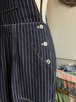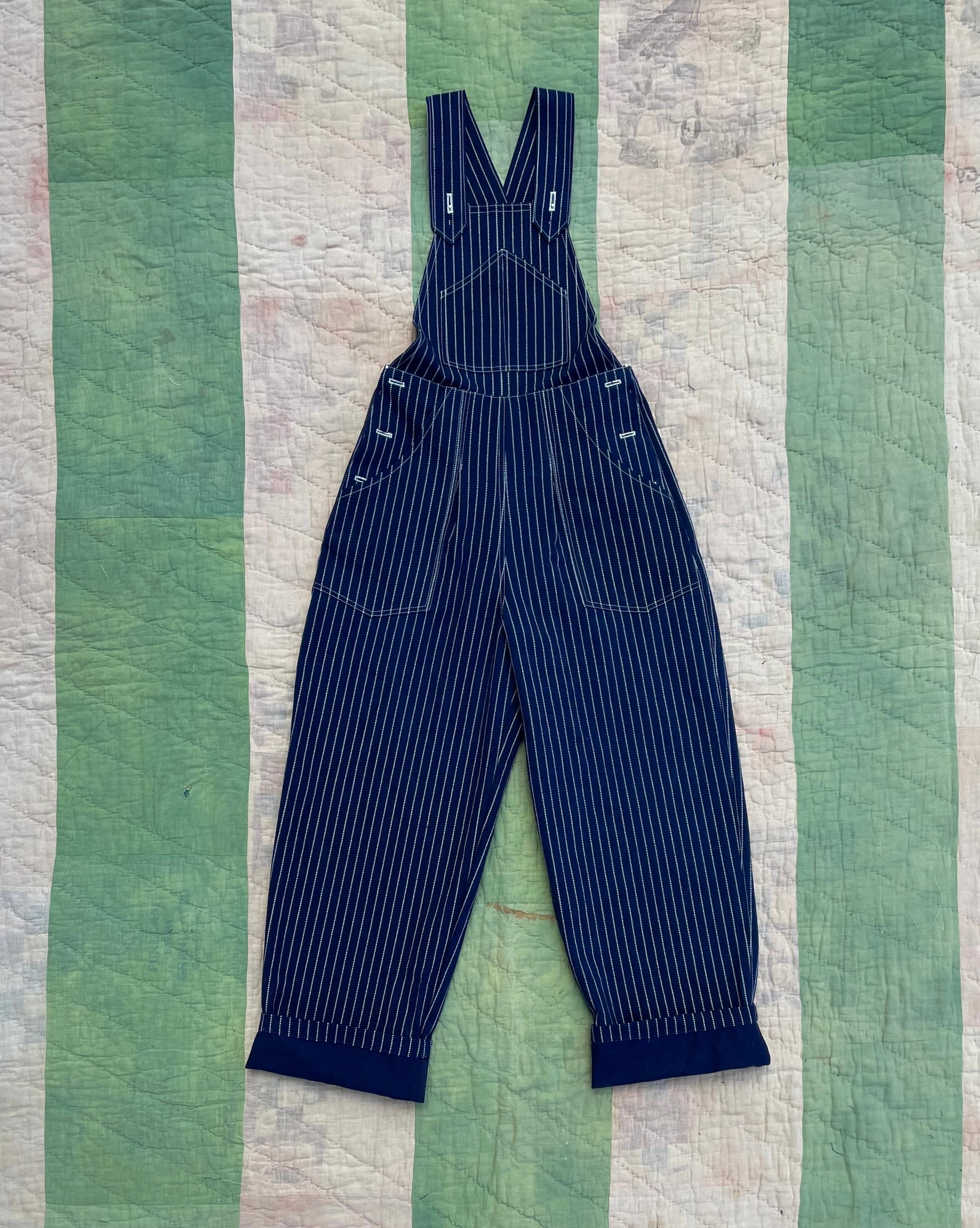 1940’s women’s workwear overalls made from a true vintage pattern. Classic Wabash fabric but in a darker indigo and donut buttons. The fabric will brighten up overtime when washed. I have a pair of my own and wear it almost every day! Such a comfy fit and really fun to style with. The overalls are meant to be oversized for a relax fit, but cinched would look good too.