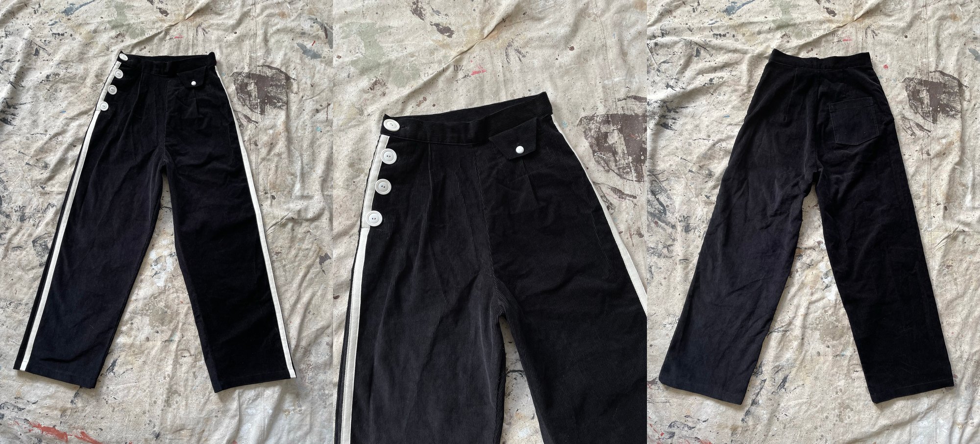 Made in 100% cotton corduroy and cotton twill bias tape. *I hand dye the cream corduroy and try to dye each pants the same color. However, hand dyeing produces different shades of color. All cream corduroy trousers will be slightly different in color, but I’ll try my best to keep it the same as the photo shown.
