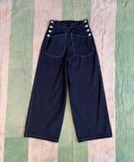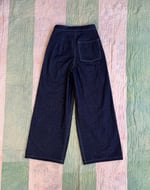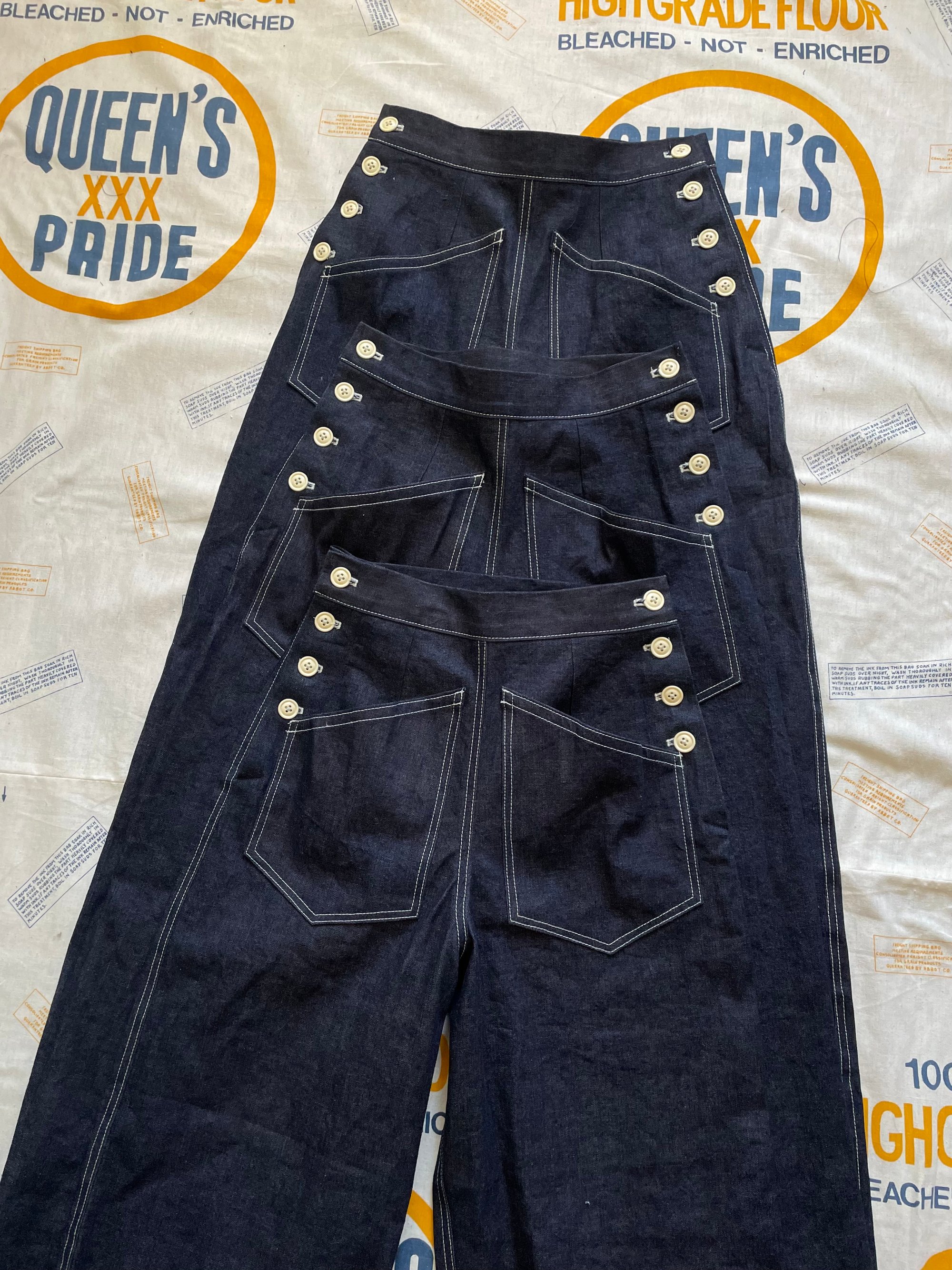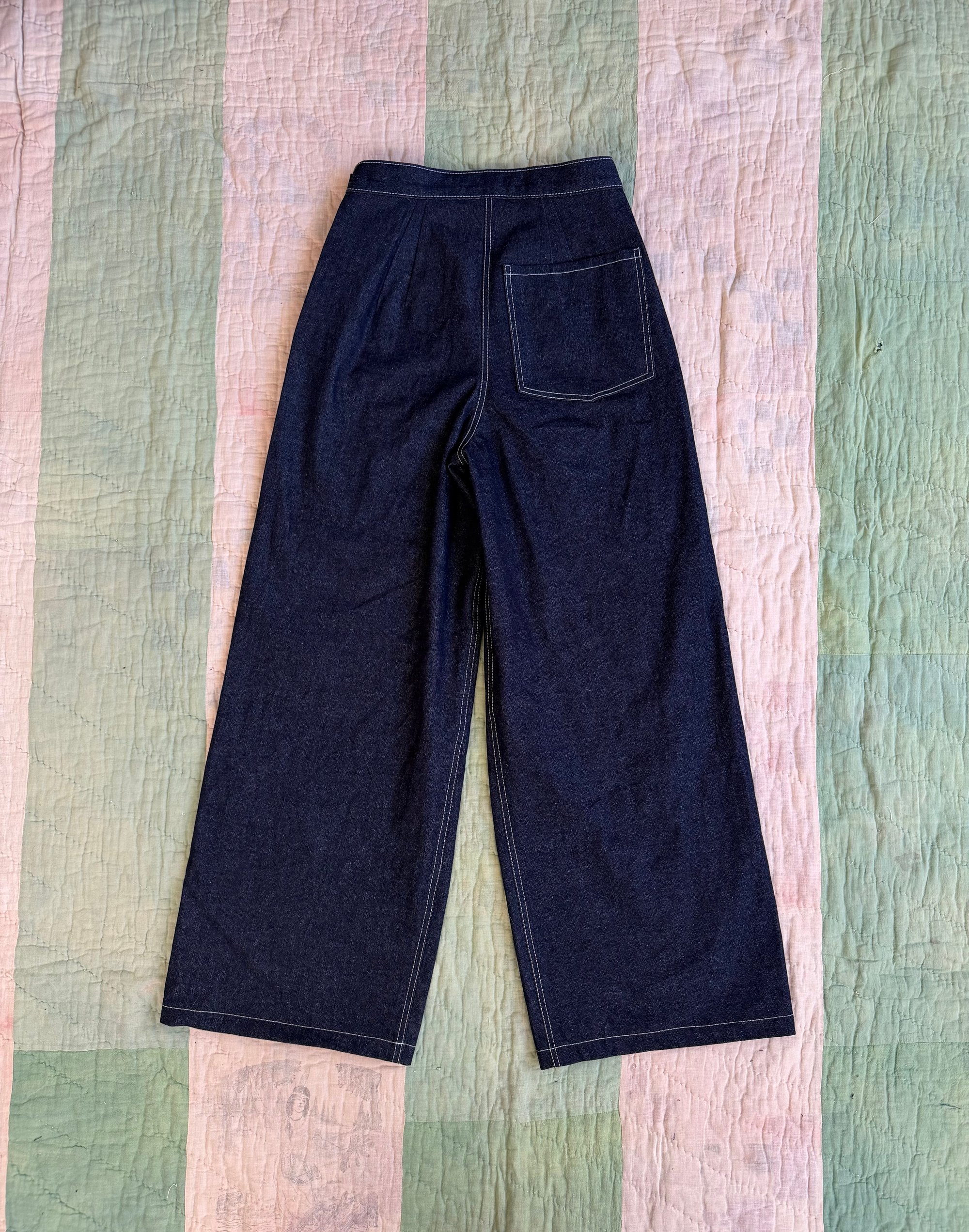 1940’s inspired denim pants made in 11oz 100% cotton dark wash indigo denim. This style has plenty of room in the hips, high waisted, and a straight leg. Two giant front pocket and a single right butt pocket. That classic 40’s silhouette!