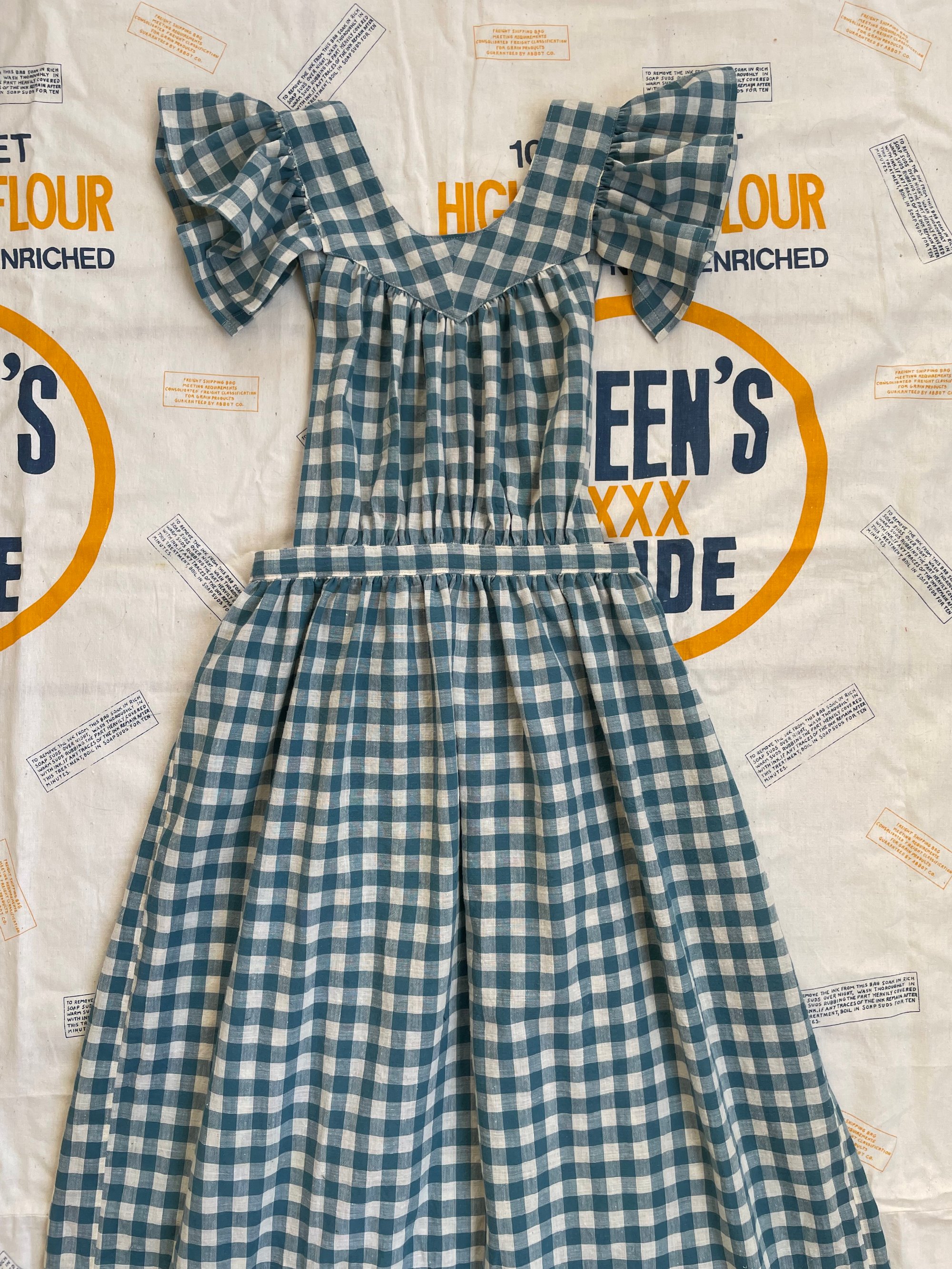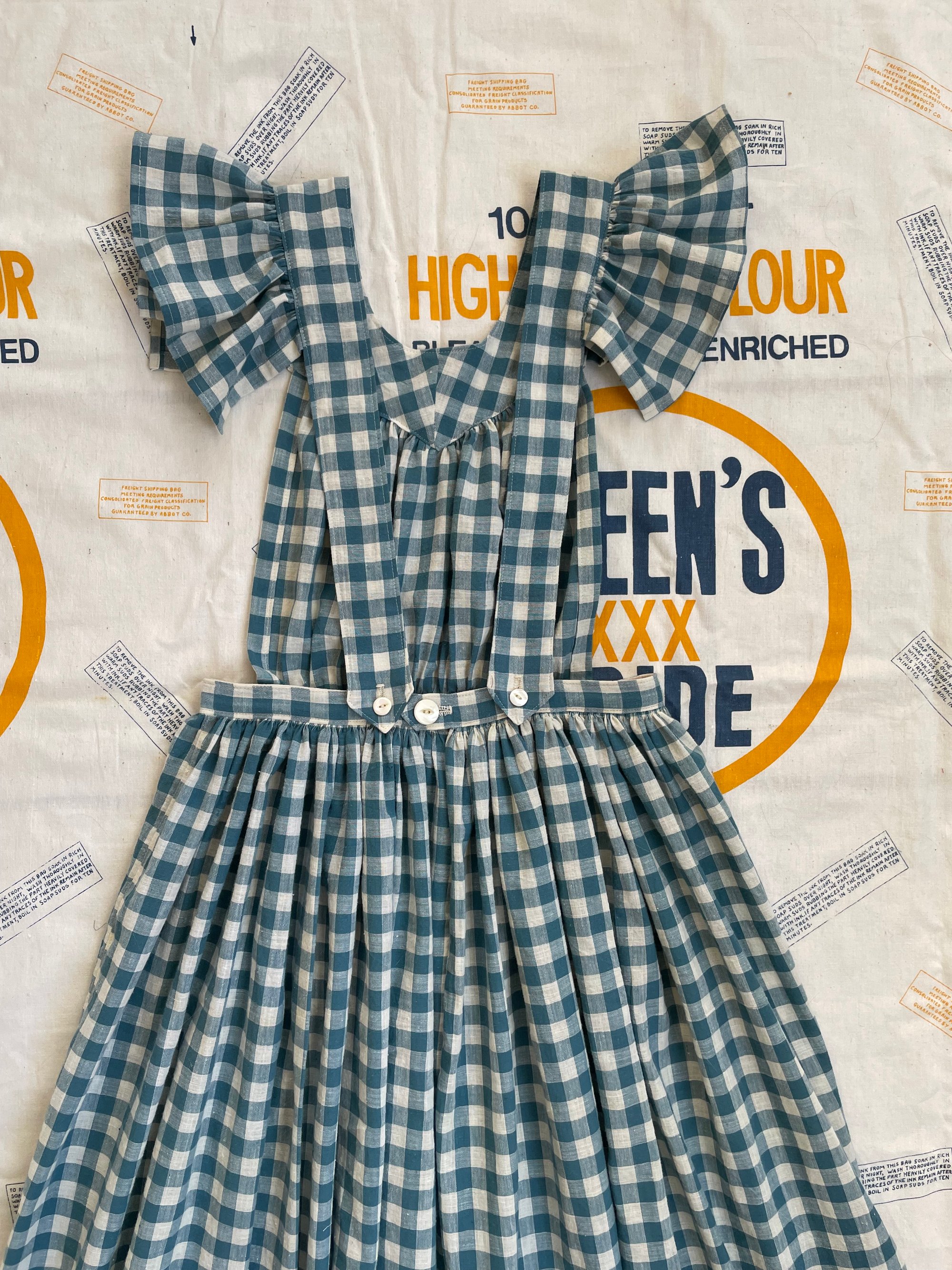 Priscilla is based off a 30’s/40’s apron that I was lucky enough to make a pattern of it. I used true 1930’s cotton gingham I had been saving for over a year for the right project and I think it was meant to be! I added vintage mother of pearl buttons and hand sewn the button holes myself~ She’s really special and she’s ready to ship!