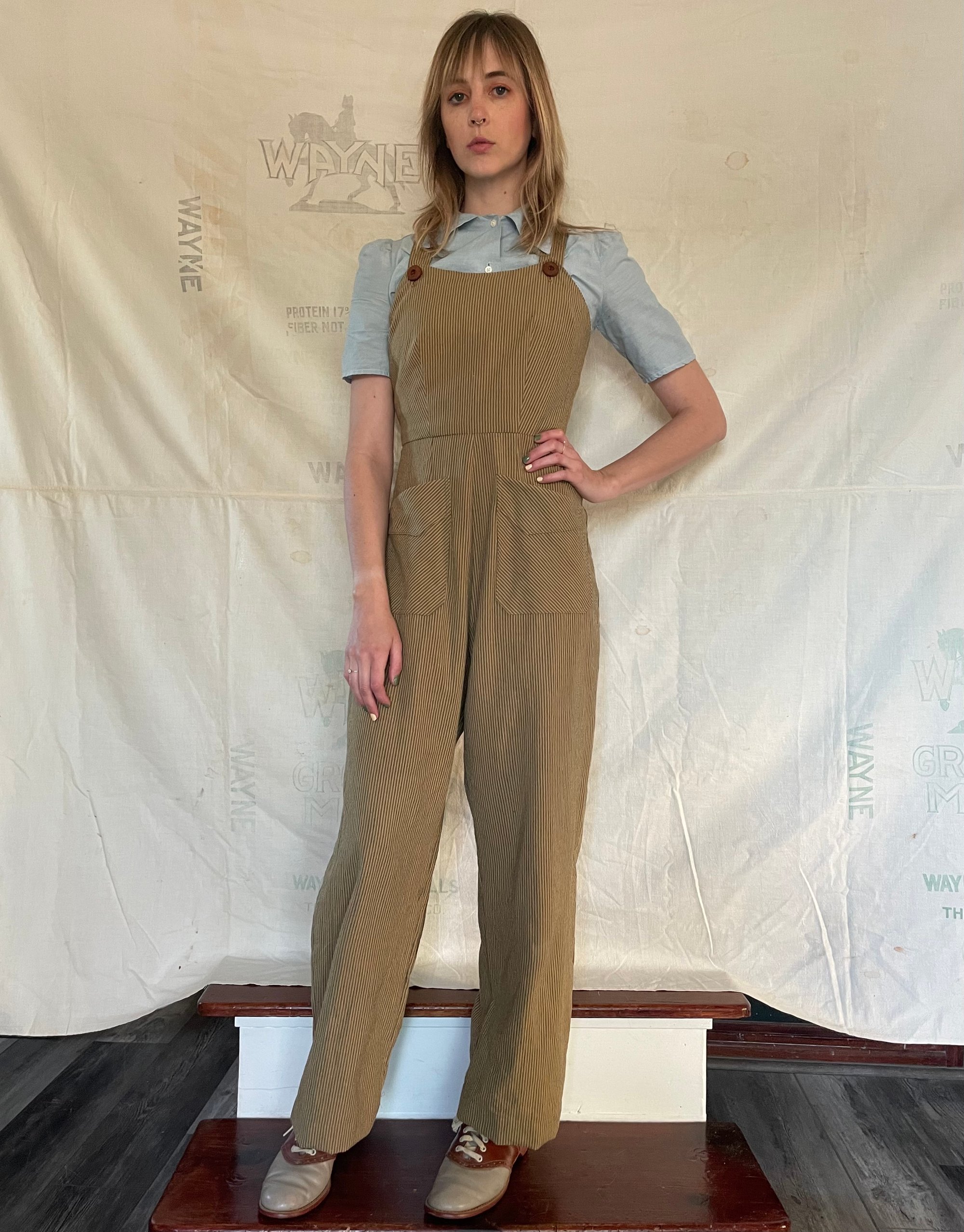 1940's inspired overalls made with green and tan stripes homespun cotton fabric. Please note that this classic silhouette style has a slight drop to the back rise and wont be skin tight.