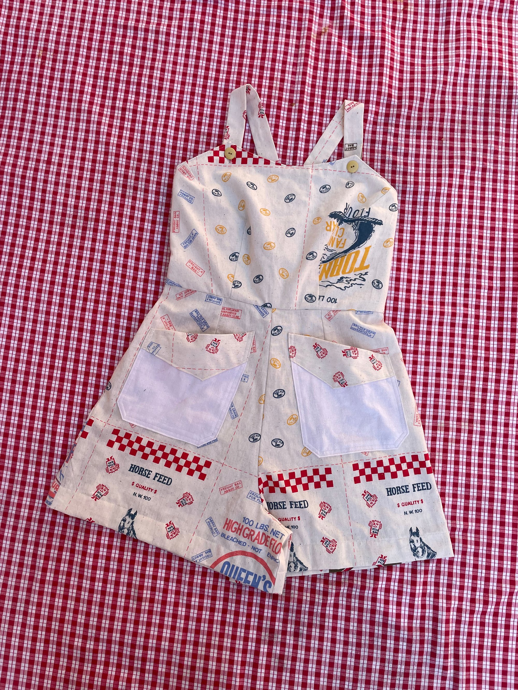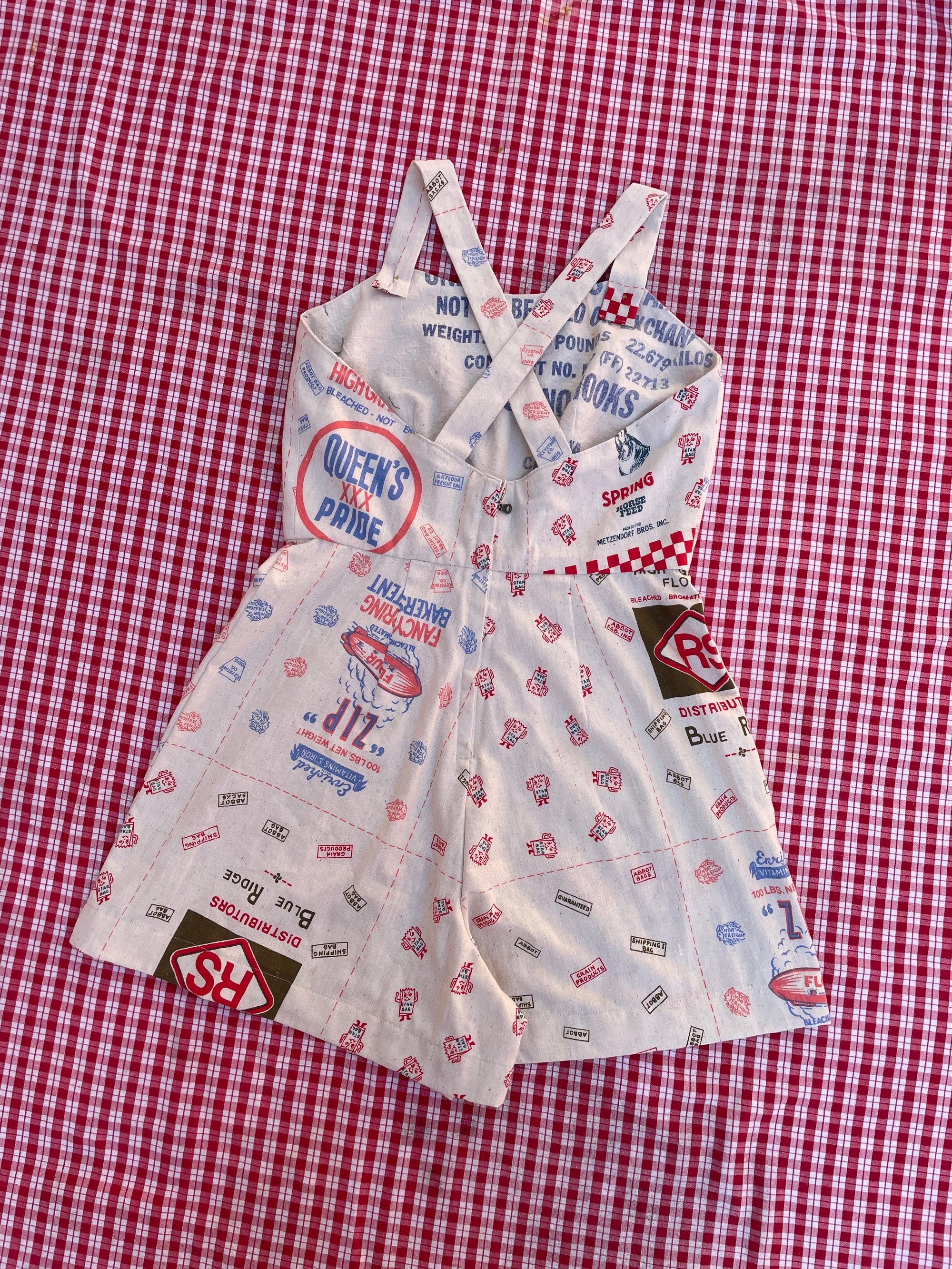 1940’s inspired romper made with vintage feedsacks and buttons.