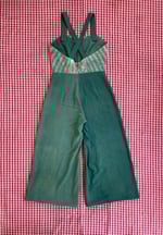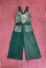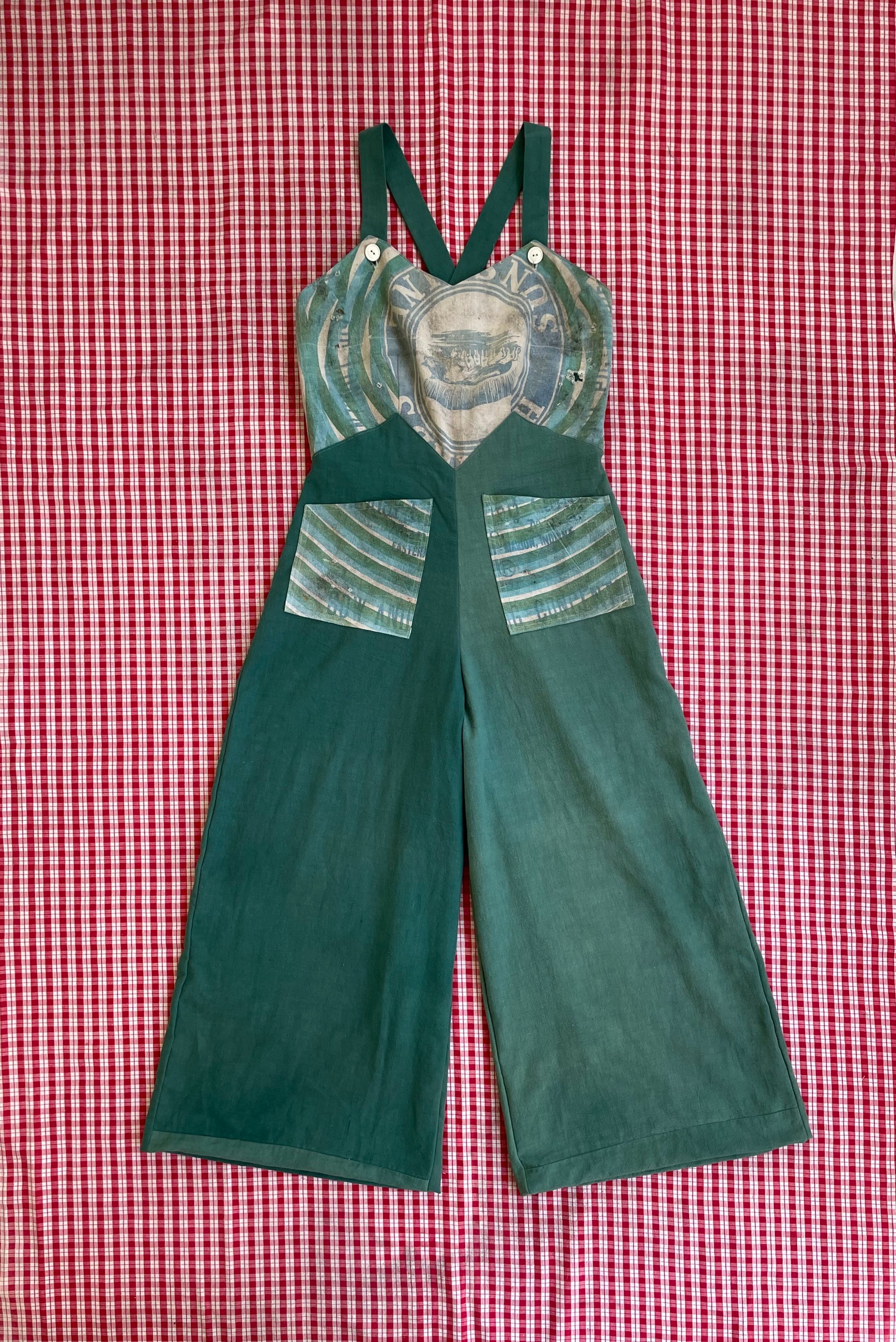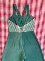 1940’s inspired overalls with a sweetheart bodice and wide leg. She’s roomy and comfy to wear just like beach pajamas! Size medium